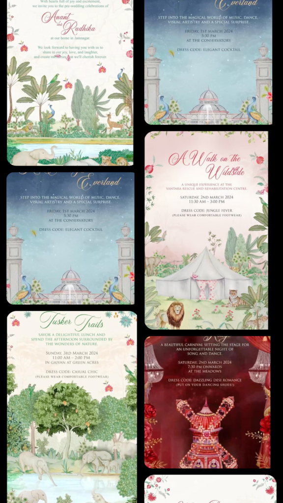 The festivities, hosted by the couple themselves, will kick off with “An Evening in Everland” on the first day, followed by two events each on the subsequent days. Guests will be treated to unique experiences like visiting the Ambanis’ animal rescue center in Jamnagar and exploring the wonders of nature during “Tusker Trails.”