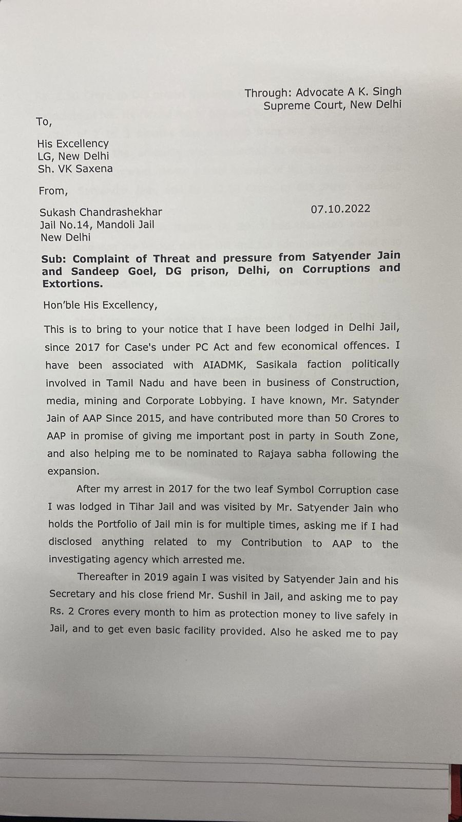 1 November 2022 (New Delhi): Thug Sukesh Chandrashekhar wrote a letter to the Lieutenant Governor of Delhi, VK Saxena, regarding Aam Aadmi Party leader and Delhi government minister Satyendra Jain. Allegations have been made. Sukesh Chandrashekhar has claimed that he has given Rs 10 crore to Satyendra Jain as protection money.