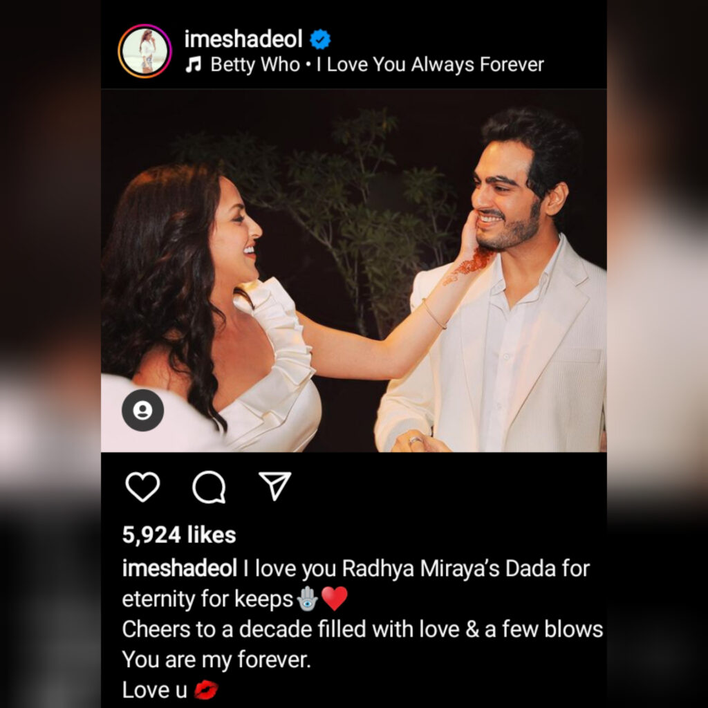Sharing this lovely photo, Esha wrote in the caption, “I love you Radhya-Miraaya’s Dada, eternity for keeps. Cheers to decade filled with love and a few blows. you are my forever.” From fans to celebs are congratulating him on his 10th marriage anniversary.