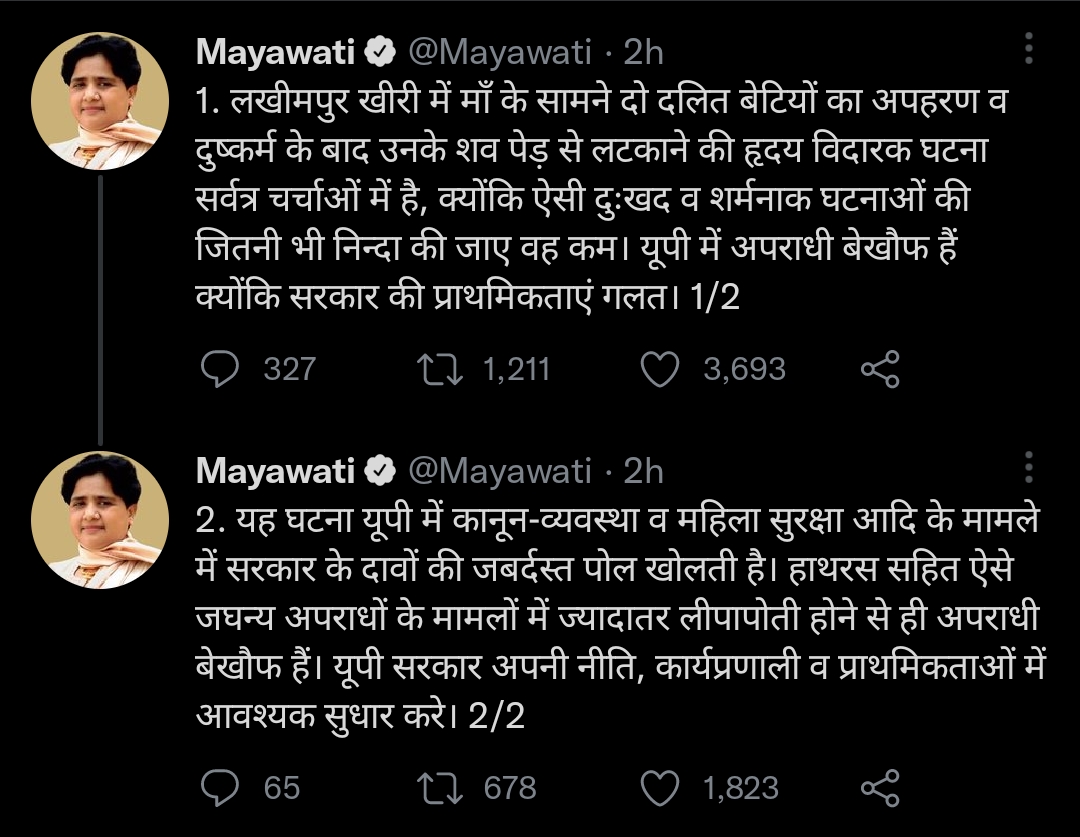 She twitted that, ” This incident has exposed the law-and-order situation in the state and the false claims made by the ruling government on women’s safety etc. in UP. Government is busy hiding the truth in such heinous crimes including Hathras and the criminals are fearless. The UP government should make necessary reforms in its policy, methodology and priorities.”