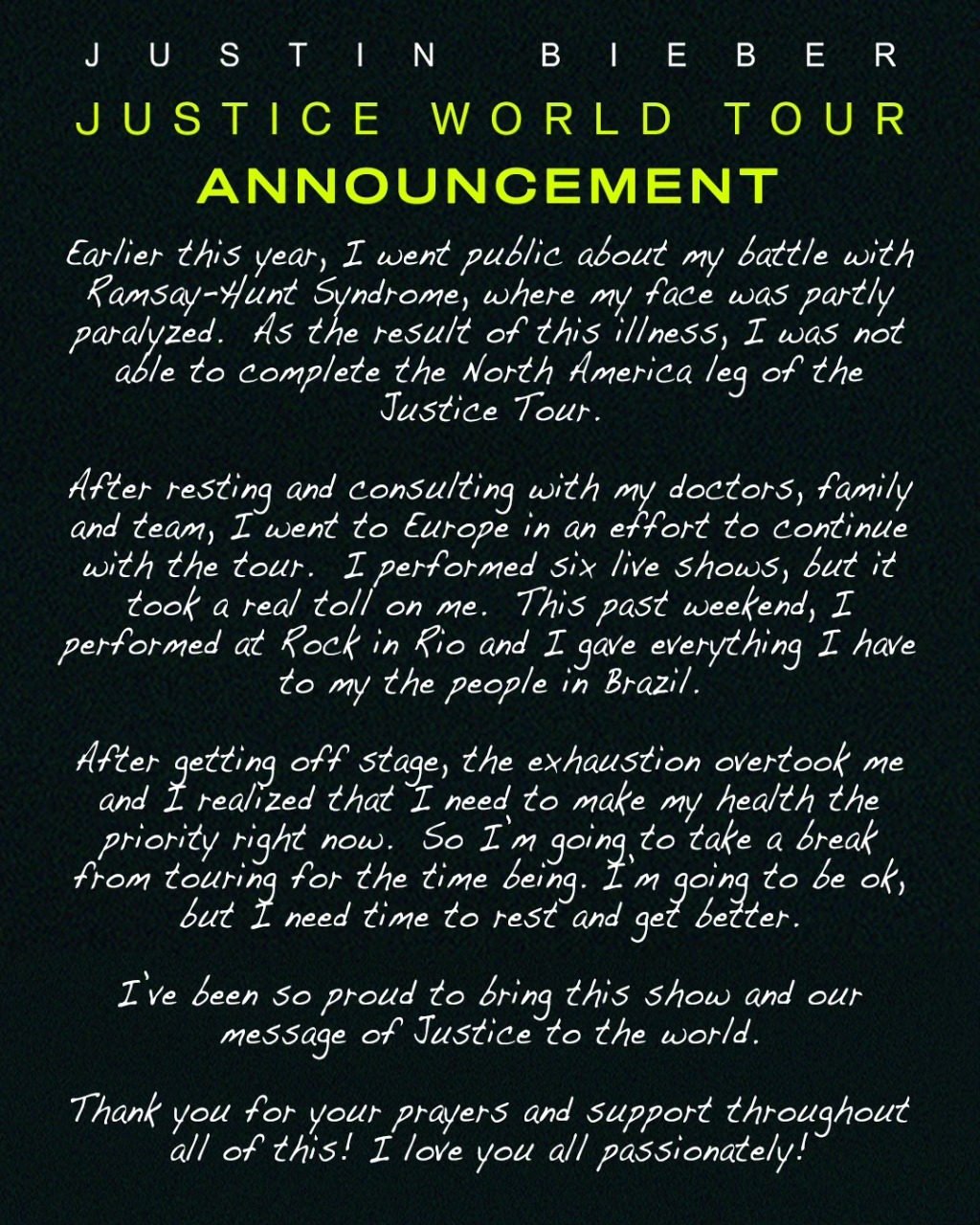 Taking to Instagram handle, Justin shared a post in which he wrote, ” Earlier this year, I went public about my battle with Ramsay Hunt Syndrome, where my face was partly paralyzed. As a result of this illness, I was not able to complete the North America Leg of the Justice tour. The announcement came soon after Justin Bieber was seen sharing glimpses from his Justice Tour concert in Rio.”