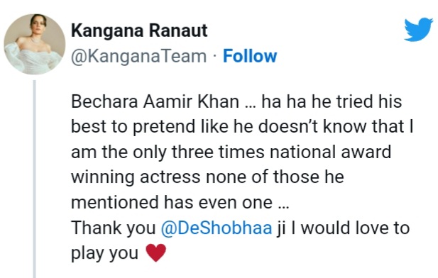 Kangana shared the video from the book launch, and wrote, “Bechara Aamir Khan (poor Aamir Khan)… ha ha he tried his best to pretend like he doesn’t know that I am the only three times national award winning actress none of those he mentioned has even one…Thank you @DeShobhaa ji I would love to play you.” She further tweeted, “Sorry I have four national awards already and a PadmaShri my fans reminded I don’t even remember how many I have.”