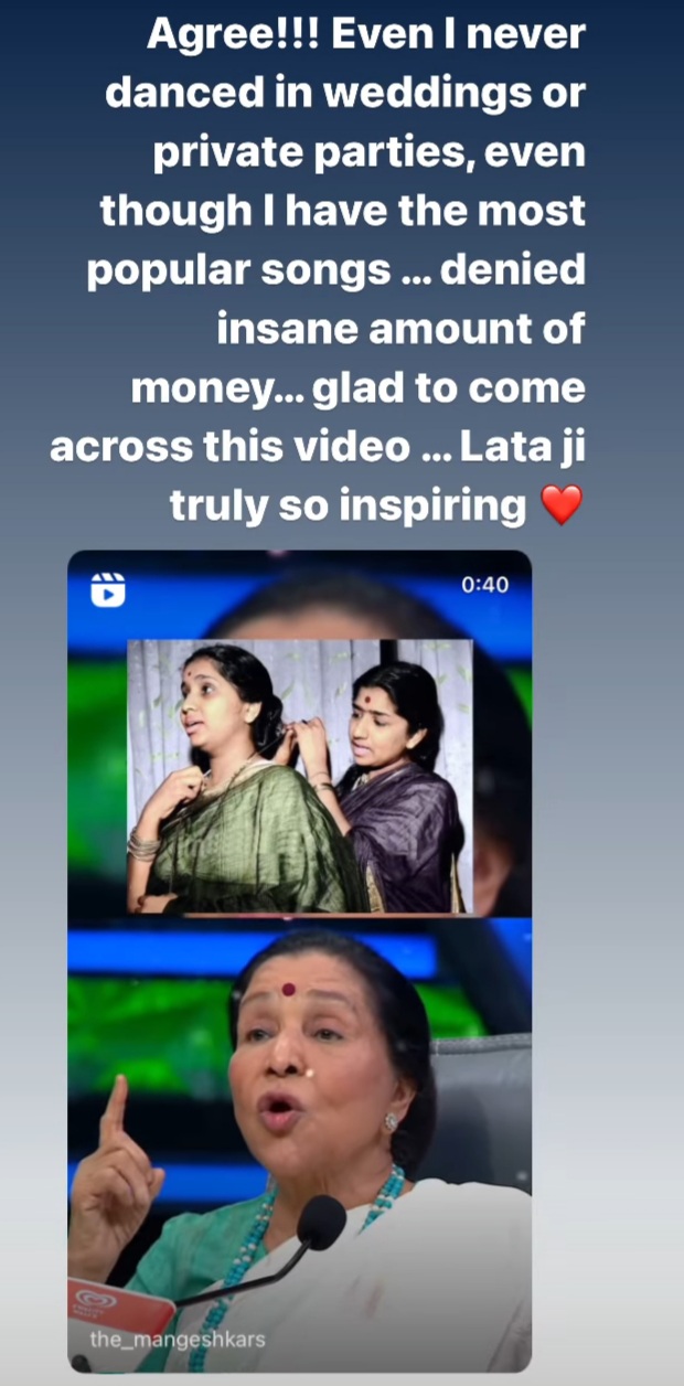 In the video, Asha Bhosle is talking about how her elder sister and legendary singer was once offered a million dollars to sing at a wedding, but she refused the offer. She was heard saying: “Kaha 2 ghante sirf aap darshan dijiye humari shadi meina (just come to our wedding for 2 hours, they had said to her).” Kangana captioned: “Agree. Even I never danced in weddings or private parties, even though I have the most popular songs…denied insane amount of money…glad to come across this video.. Lataji truly so inspiring.”