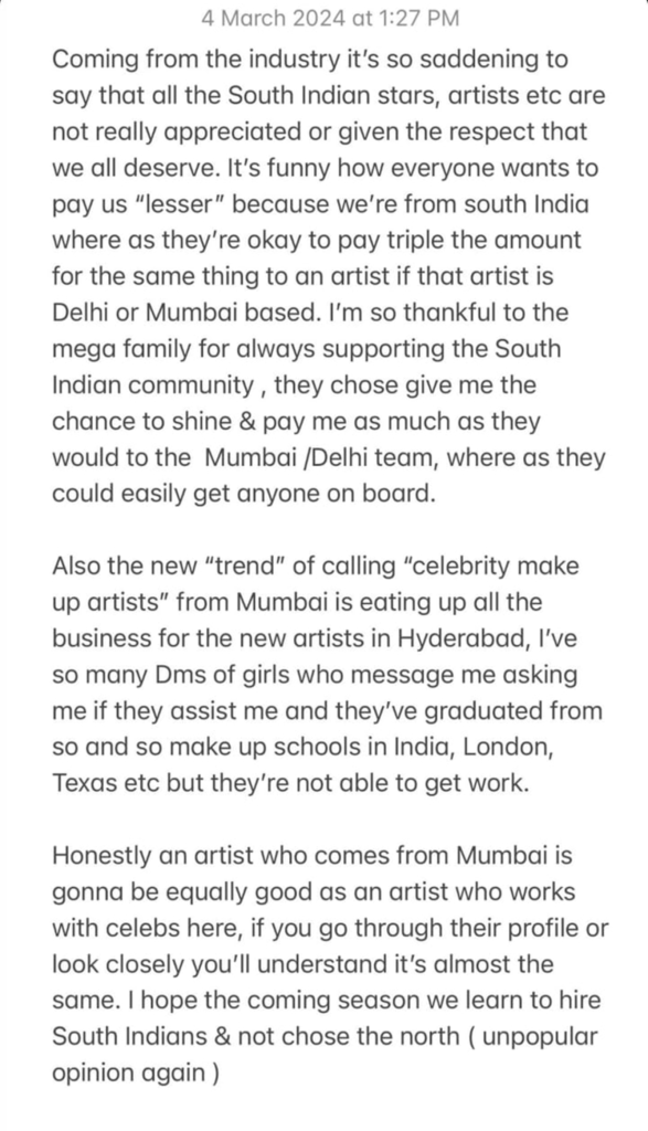 Hassan went on to say in an Instagram statement that South Indian artists are not respected or given enough credit. “It’s funny how everyone wants to pay us ‘lesser’ because we’re from South India. But they’re willing to pay an artist based in Delhi or Mumbai three times as much for the same thing,” she continued.