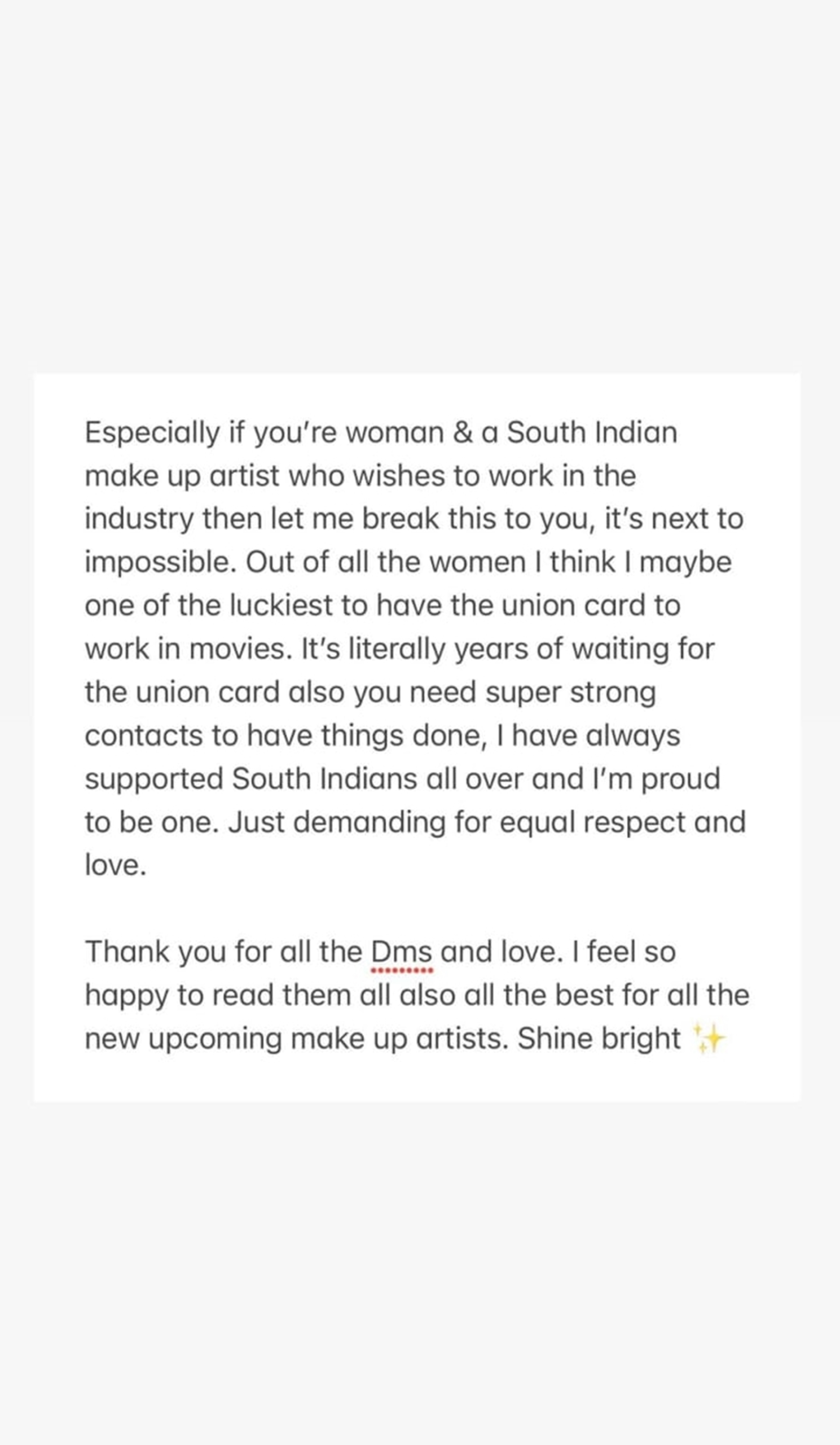 Hassan went on to say in an Instagram statement that South Indian artists are not respected or given enough credit. “It’s funny how everyone wants to pay us ‘lesser’ because we’re from South India. But they’re willing to pay an artist based in Delhi or Mumbai three times as much for the same thing,” she continued.